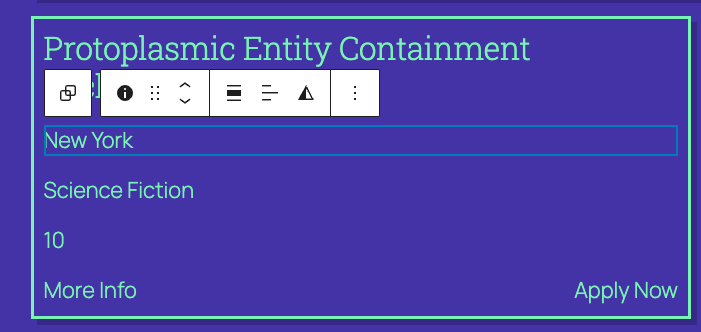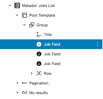 The main difference you will notice using the blocks here, is there won’t be any actual job data to show in the context of the editor. Instead you will see placeholders like this: