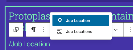 The Job Location block relies on having access to job data, this means it must be used in a context where a specific job’s data is accessible. For use on the jobs archive, this means the Job Location block should be used within a Query Loop block, Matador Jobs List block or equivalent.