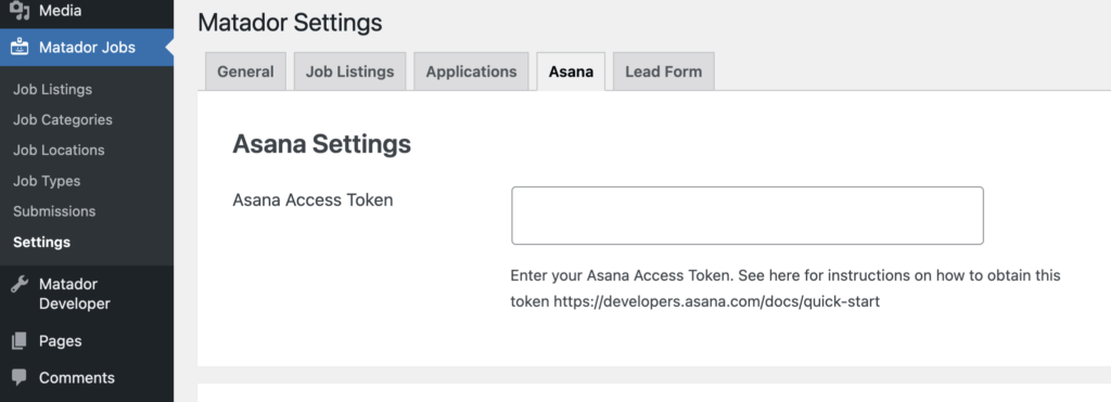 To integrate Asana with Matador Jobs Pro, you’ll need to generate a personal access token from Asana: you can see their instructions on how to do this here.