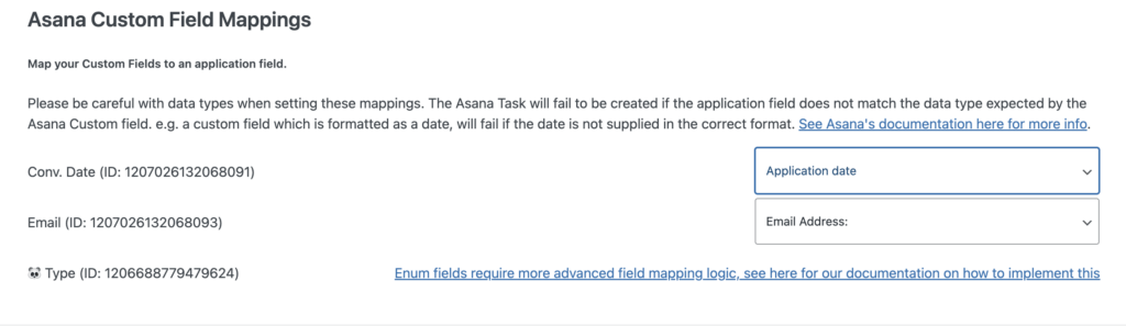 When setting up these mappings, it’s very important to pay attention to the types of data your Asana custom field can accept – if incorrectly formatted data does make it into the task creation request, then the task will not be created in Asana.