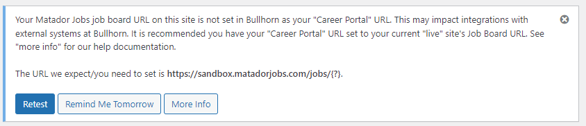 Matador Jobs 3.8.0 introduced a feature to occasionally validate that the careerPortalDomainRoot value in Bullhorn matches the expected value for your Matador Jobs job board. When a mismatch is found, you will be provided a warning on all your Matador Jobs admin screens in the WordPress admin.