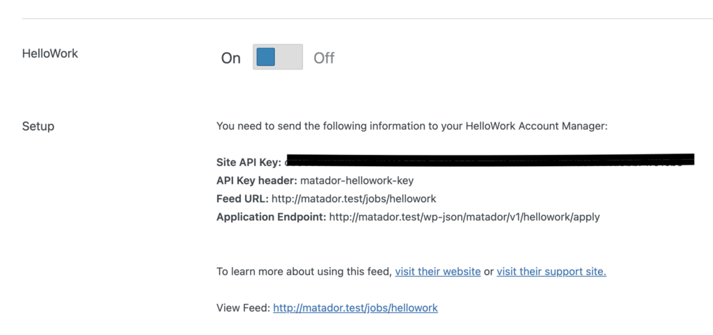 Once you have the feed set up and visible, you will need to contact your CSM at HelloWork and ask them to integrate with your site: you will need to send them all the information cited in the HelloWork section of the Syndication Feeds tab in Matdor’s settings: Site API Key, API Key Header, Feed URL, and Application Endpoint.