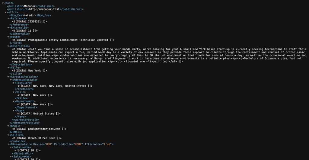 Once this is done you can go to the URL of your HelloWork Syndication (indicated in its settings section) to check that the feed contains your job’s data, you should see an XML feed ressembling this:
