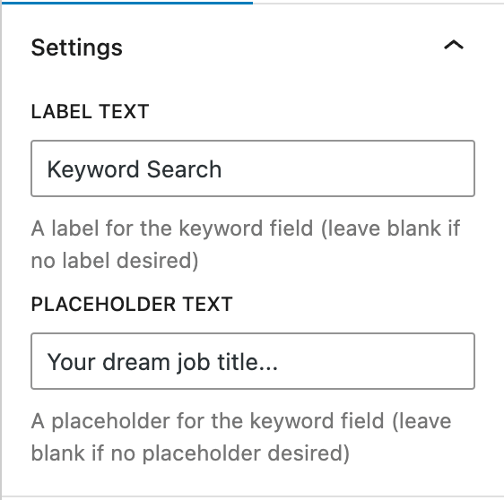 The Job Search Keyword Field block is used to add a keyword search input to the Job Search block. This keyword search will use WordPress’ search to find jobs based on the presence of the keyword in their titles and descriptions.